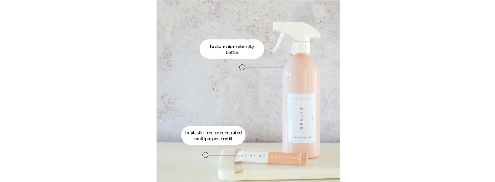 Pretty much all cleaning products contain ninety per cent water with a dose of toxic chemicals and a heavy load of greenwashing. We don't ship water. With Spruce, you reduce your carbon footprint by filling up the bottles from your tap at home! How about that?